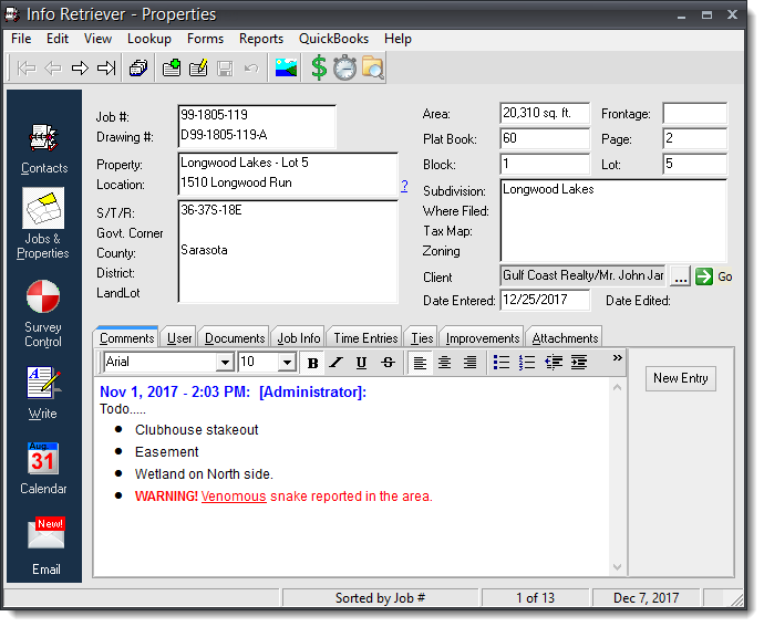 Designed specifically for surveying and engineering firms, Info-Retriever helps you run your business better. Keep track of clients, jobs, appointments, tasks, time, documents, drawings, survey control and more... all in one central location.
