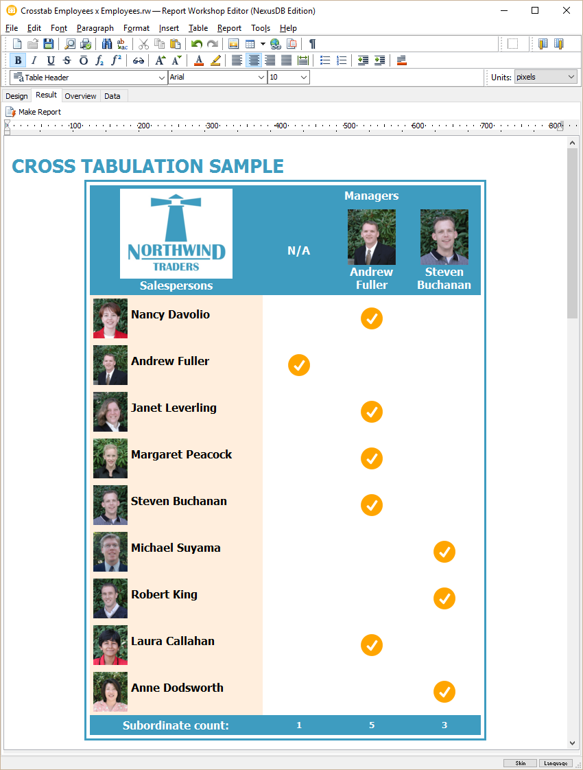 A layout of cross-tab table gives a lot of information by itself, for example count and location of data and summary columns for each level. Content of each cell is edited by the user just like in any other part of a report template.