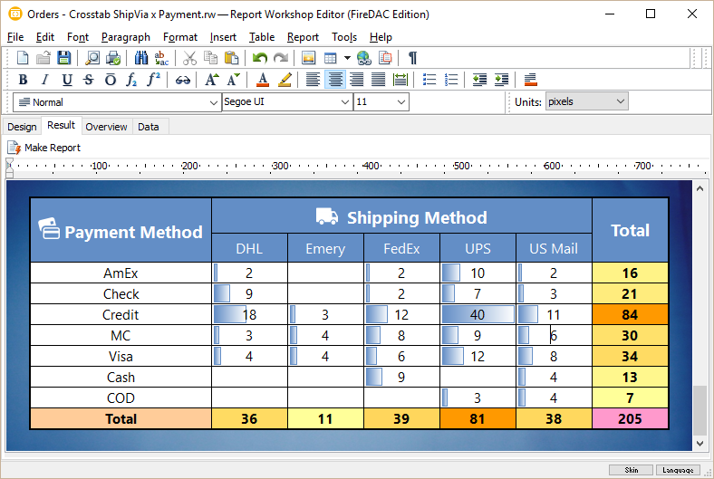 each cell may contain not a single value, but any formatted text and images; cells may even contain sub-reports